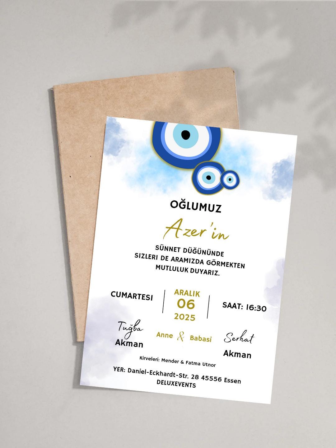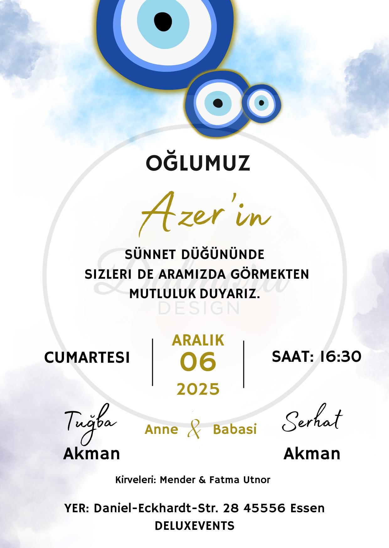 Bu şık ve kişiye özel sunnet davetiye kartı ile çocuğunuzun özel gününü kutlayın! Dijital dosya olarak sunulan bu davetiye, evde basılabilir veya profesyonel baskı için kullanılabilir.