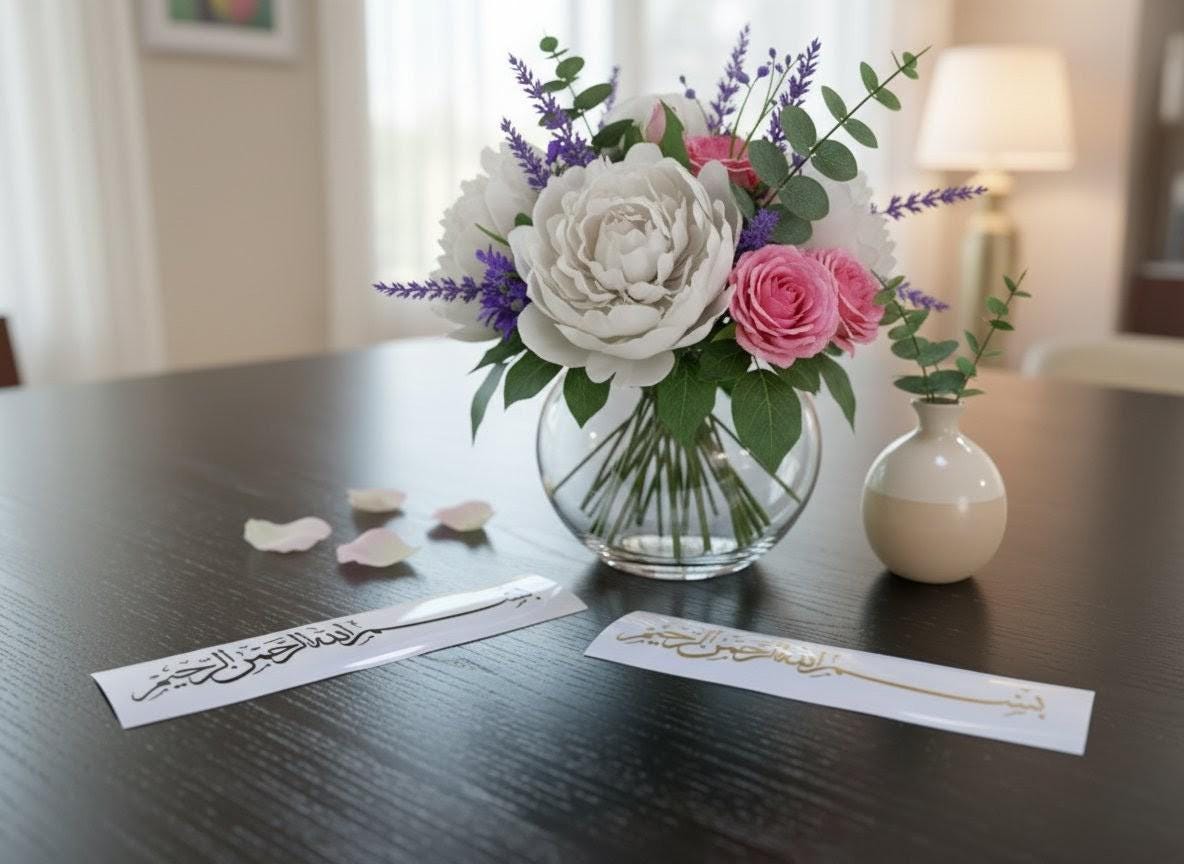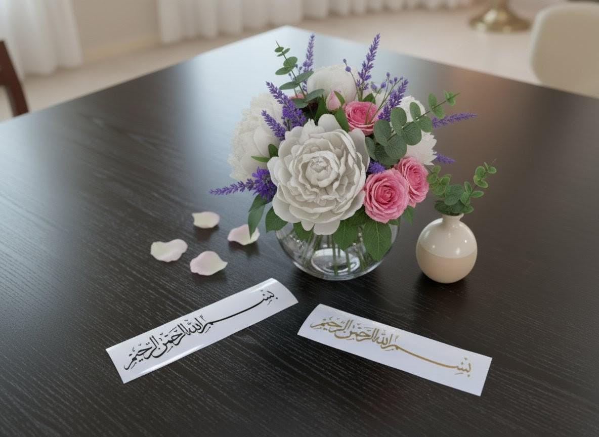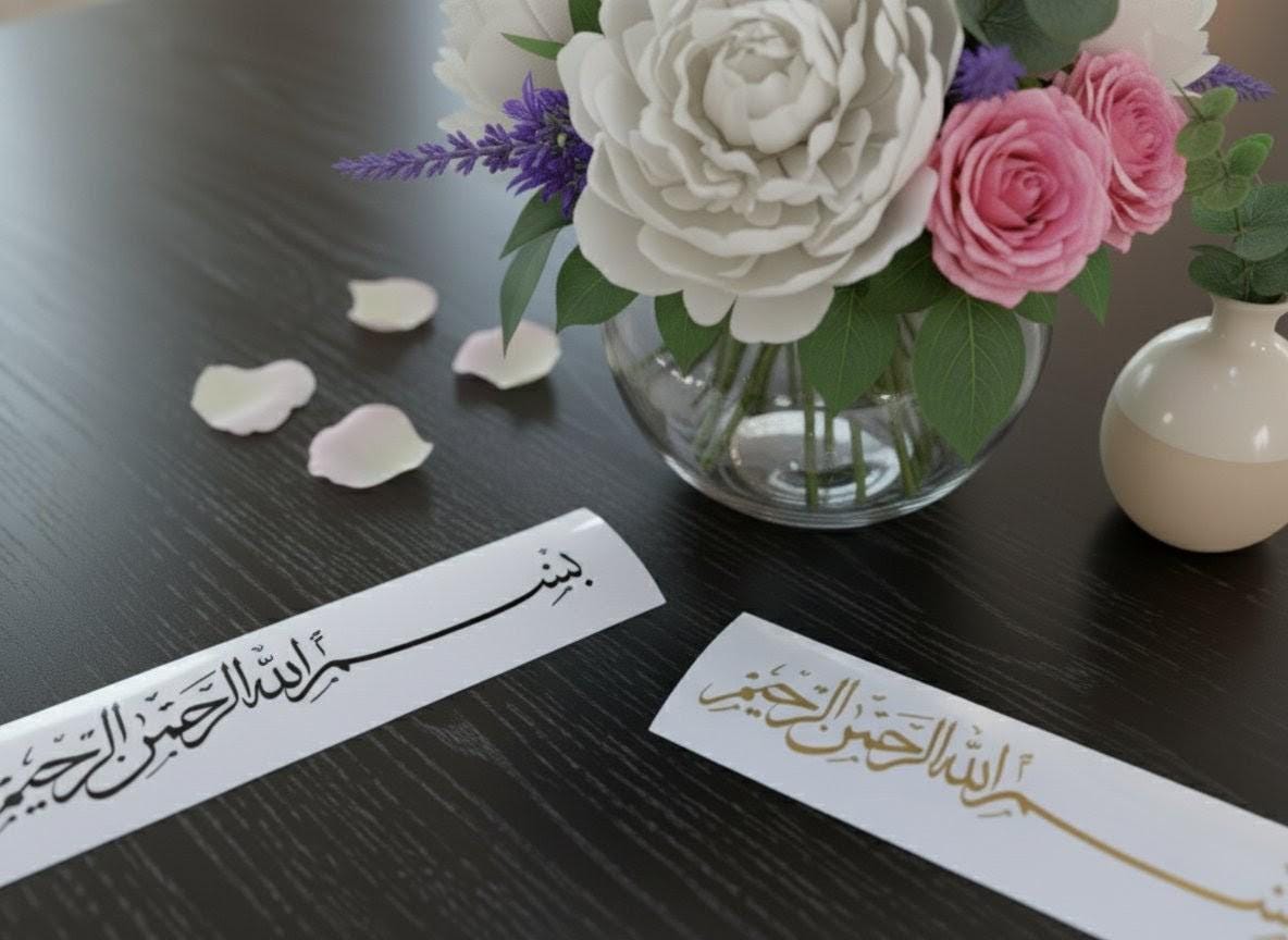 “Bismillah ir-Rahman ir-Rahim” yazılı zarif Arapça vinil sticker — “Rahmân ve Rahîm olan Allah’ın adıyla” anlamına gelir.