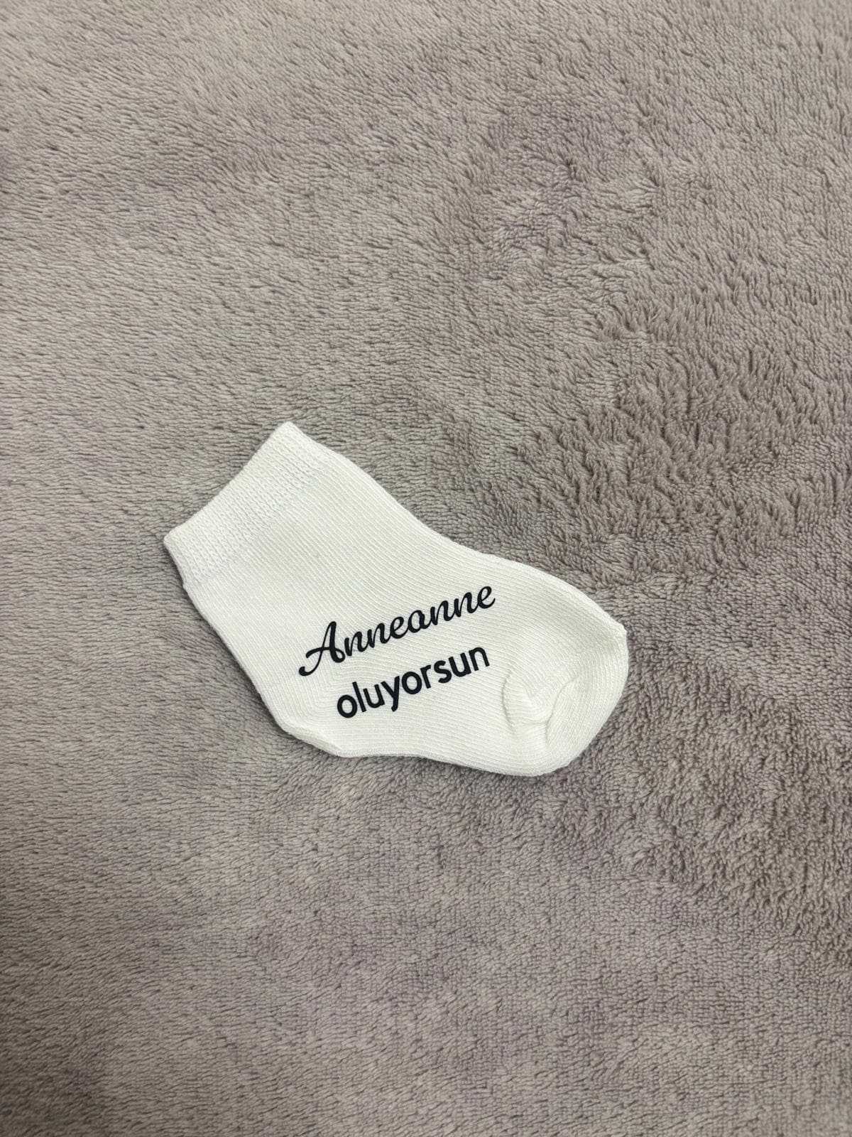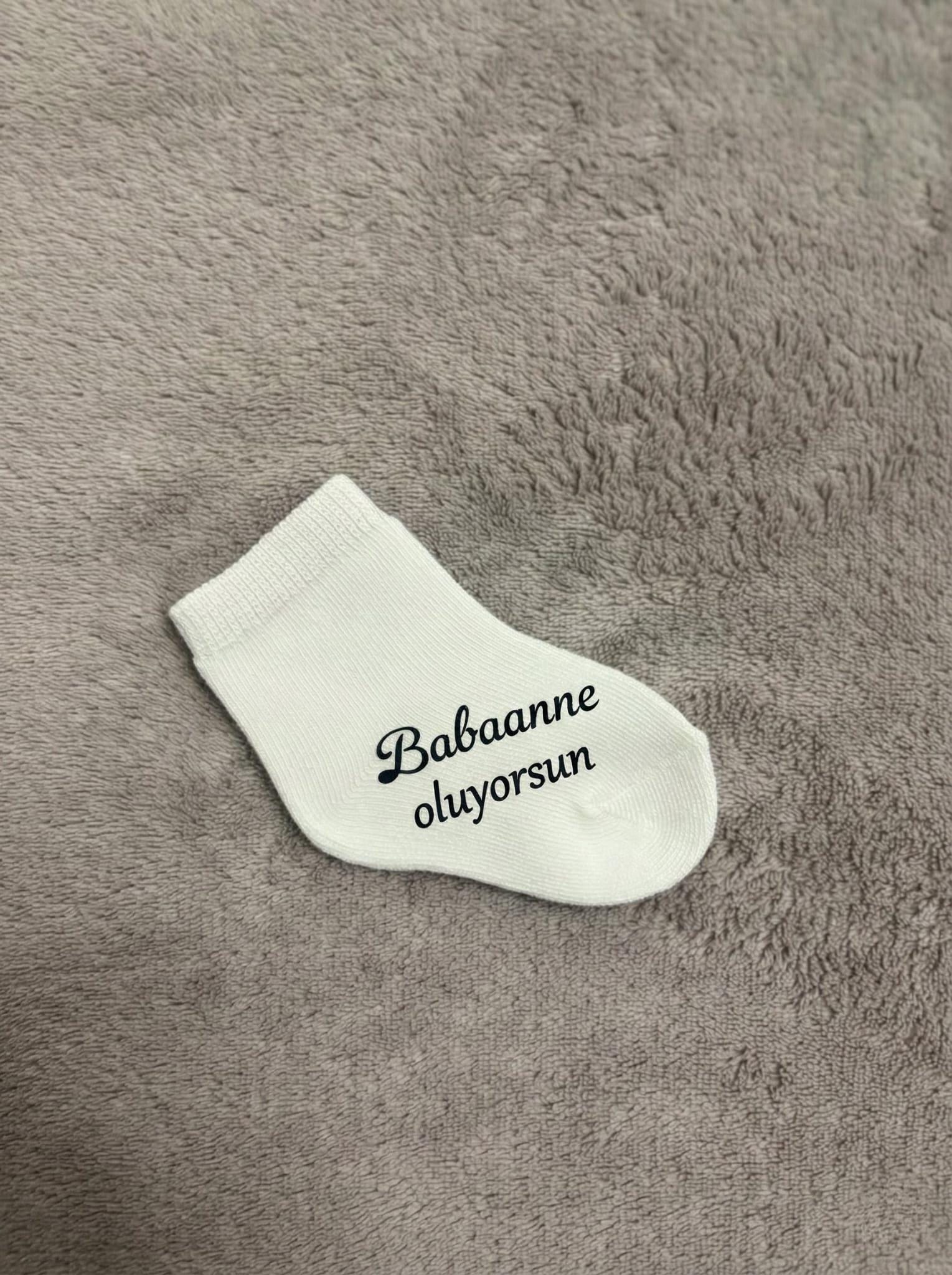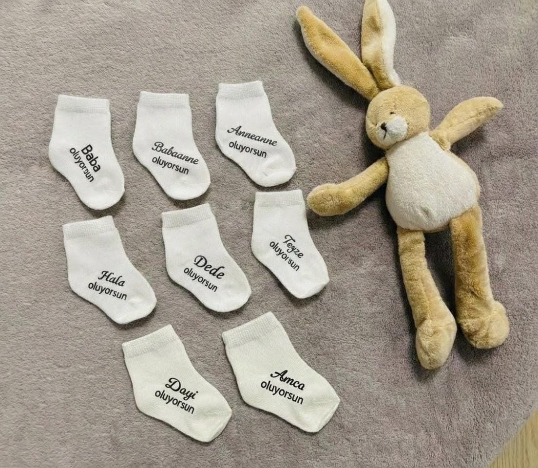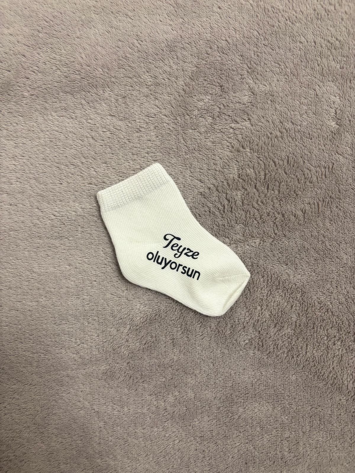 Hamilelik duyurusu için sevimli yazılı bebek çorabı.