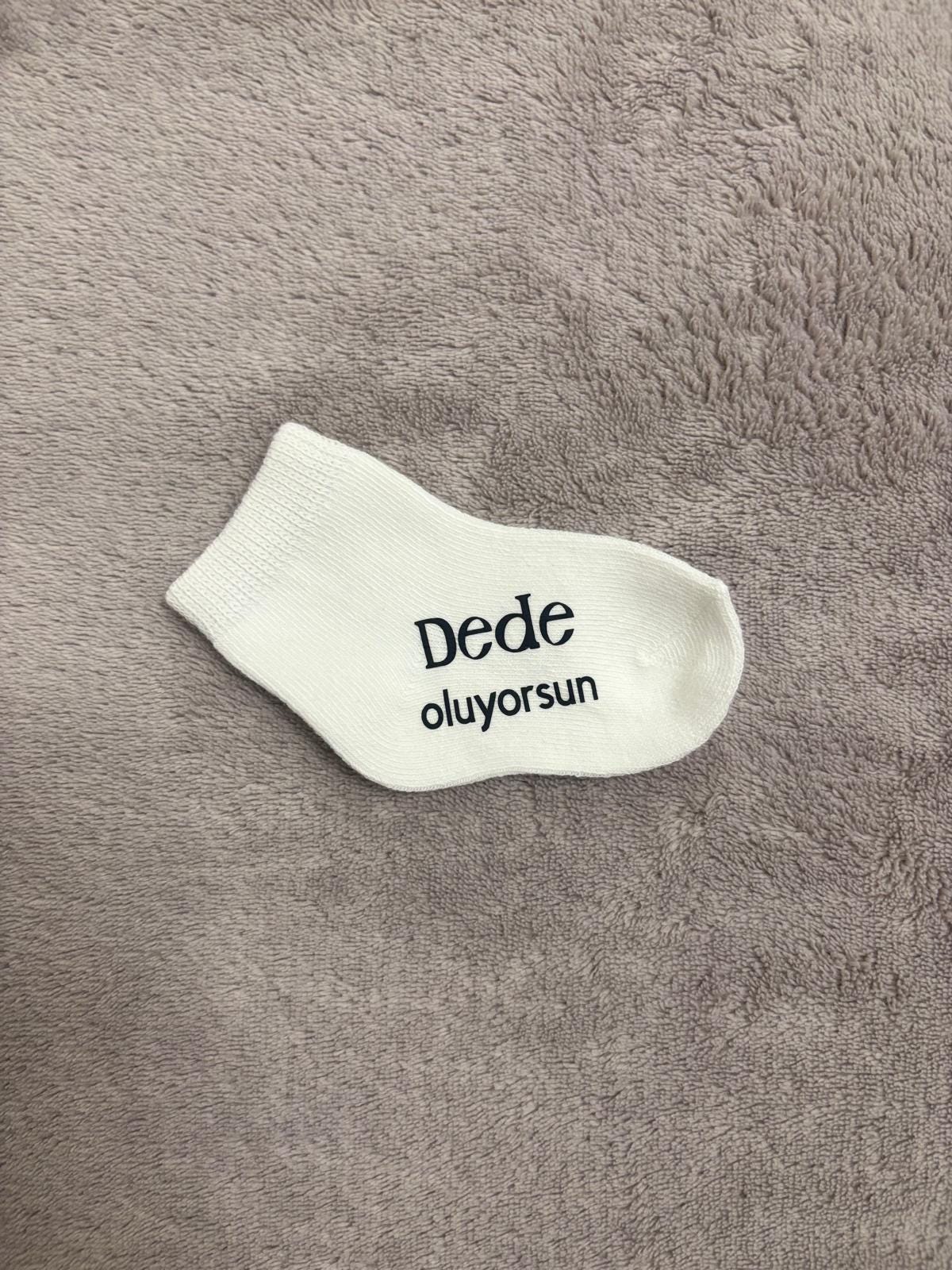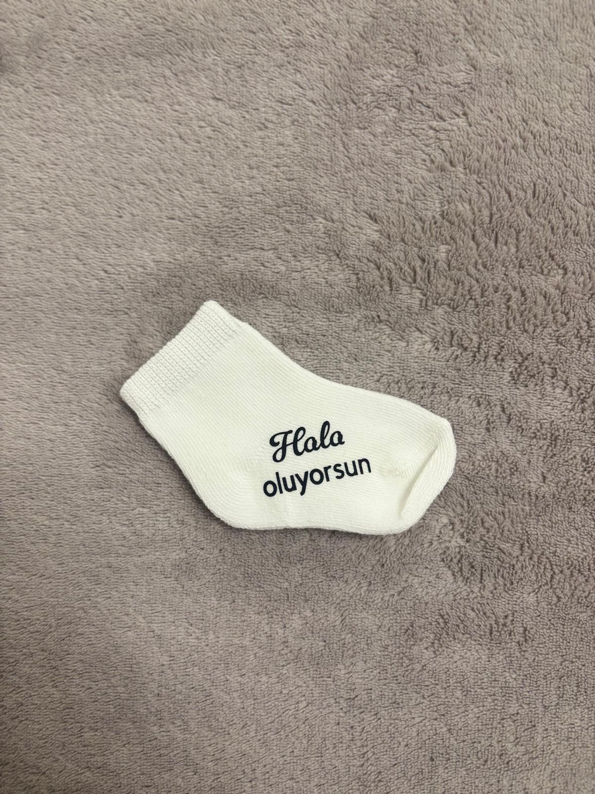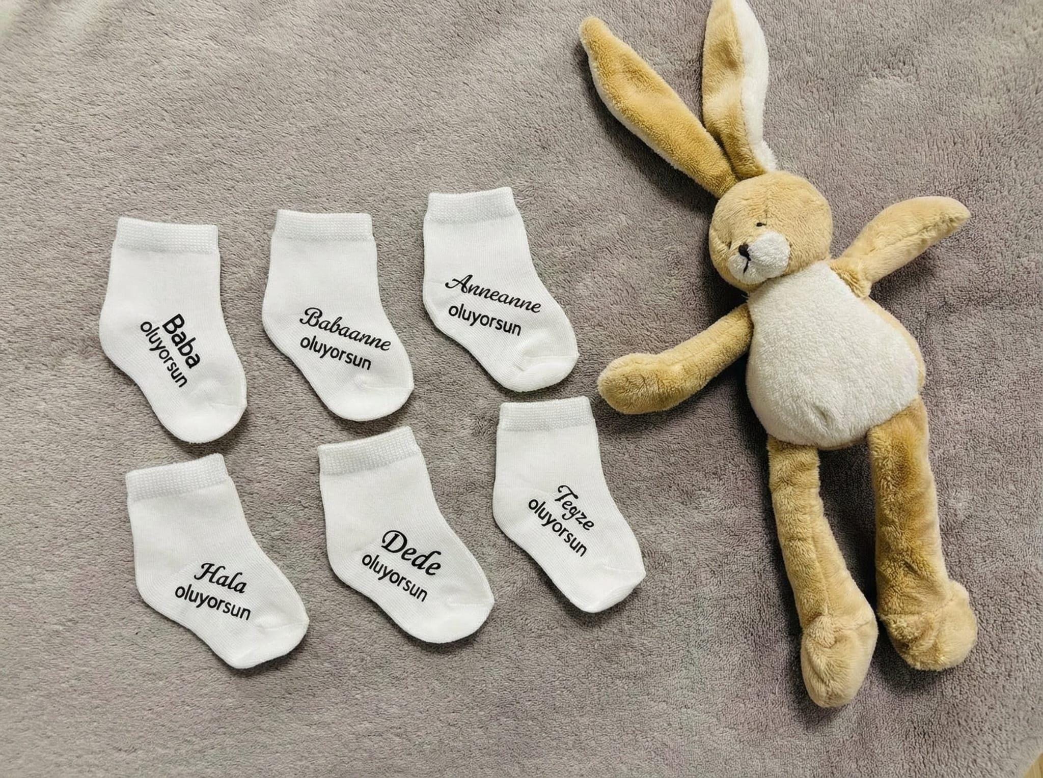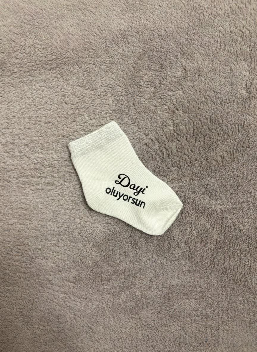 Hamilelik duyurusu için sevimli yazılı bebek çorabı.